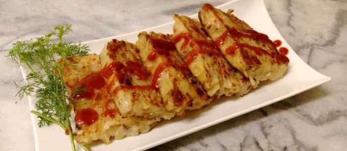 - 切塊香煎: 將完全冷卻的結頭菜糕倒扣出來,切成適當大小的厚片(約1.5公分厚)。平底鍋放稍多一點油(煎起來才香),燒熱後放入糕片,用中火煎至兩面金黃酥脆即可。咬下去,外層是脆脆的鍋巴口感,裡面是軟Q帶著結頭菜絲的清甜和餡料的鹹香,沾點蒜蓉醬油膏就超完美!這個結頭菜料理當點心或輕食超滿足!