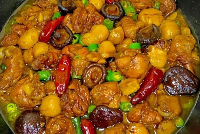 - 材料:竹絲雞塊、乾香菇(泡發)、熟栗子、蔥段、薑片、蒜頭、蠔油、醬油、糖、米酒。