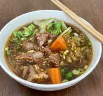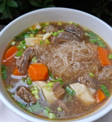 - 把燙熱的冬粉放入碗中,再沖入滾燙的牛肉湯和料。