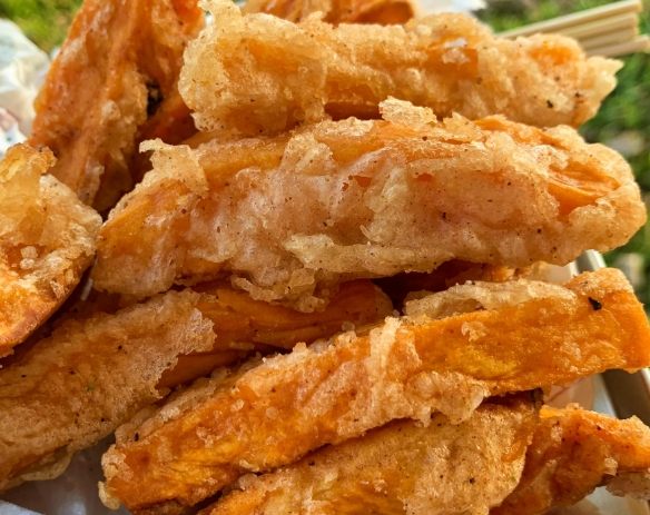 - 特色與亮點: 沒有招牌,就在蓮心冰雞爪凍附近擺攤(通常是下午到晚上)。他們家的「甘梅薯條」堪稱一絕!選用新鮮地瓜現切現炸,外皮酥脆無比,內餡鬆軟香甜,熱騰騰的灑上滿滿的甘梅粉,那個酸酸甜甜的滋味,讓人一根接一根停不下來。