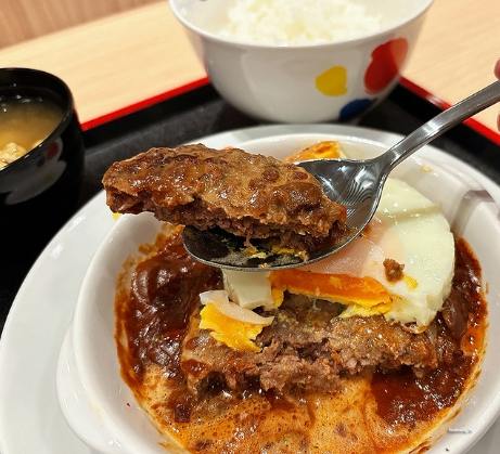 餐點選擇很單純,就是牛丼、豚丼、咖哩飯這幾種基本款,再加一些配菜組合。我的最愛是 「牛丼(並盛)」 。雖然是平價連鎖,但他們家的牛丼味道就是很標準、很順口。醬汁鹹甜適中,洋蔥煮得軟軟甜甜的,牛肉片份量以價格來說算有誠意,鋪在白飯上,再打上一顆生雞蛋(需要加點溫泉蛋或生雞蛋),攪拌開來,蛋液包裹著飯粒和牛肉,滑順又滿足!飯量給得很大方,男生也能吃飽。 「豚丼」 (豬肉)也不錯,醬汁味道類似,豬肉片口感更紮實一點。他們家的 「咖哩」 是日式甘口風格,很濃稠,拿來配豬排或漢堡排都不錯。